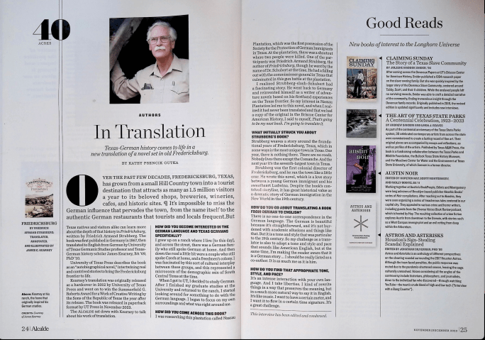 The Alcalde is the official magazine of the University of Texas at Austin. My book Friedrichsburg was featured in the Nov/Dec 2023 issue under the section “Alumni Authors.”