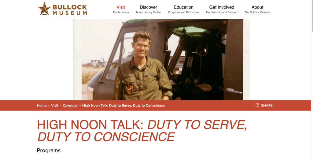 The Bob Bullock Museum sponsored a talk and and book signing to launch our new book, Duty to Serve; Duty to Conscience: The Story of two Conscientious Objector Combat Medics in Vietnam, which had just been released by the University of North Texas Press.
