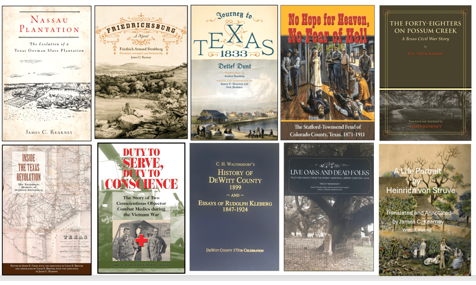 - C.H. Waltersdorf’s History of DeWitt County 1899 & Essays of Rudolph Kleberg, 1847-1924, translated and edited by James C. Kearney for the DeWitt County 175th Celebration.(Cuero: DeWitt County Historical Association, 2024).