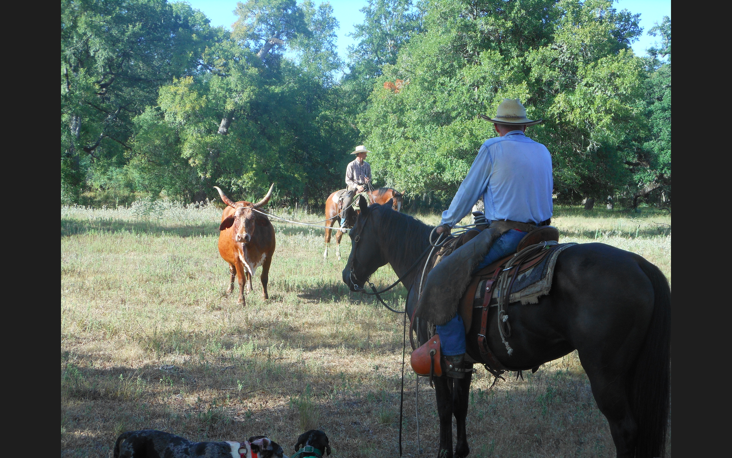 A lot of bull stories to tell. Some I experienced personally, and some have passed down through the family, like the story of Ol’ Herb and the rogue bulls. It was in the depths of the Great Depression and a man did what he could to earn a little hard cash. Papa’s neighbor, Mr. Auerbach, had two rogue bulls that he could not pen. He offered papa $10 a head to anyone who could pen them could pen them and haul them to market, good money for the times. Papa took the challenge and called on a black cowboy by the name of Ol’ Herb who helped him from time to time and though beyond his prime was still as good as they come. He was the one people called on for the really dicey jobs. They saddled up their horses and with a couple of good cow dogs, set out to pen the bulls. They found them in a stand of open post oaks. Spotting the riders and with the dogs on their tails, they broke and ran, each taking a different course, heading for thicker brush and safety. Papa yelled to Herb, “You take the brindle, and I’ll take the muley,” and each headed off at a full run with their ropes ready in hand. Herb was the first to catch his bull, making a good throw with the loop of the rope settling effortlessly around the neck of the fleeing beast. Herb hadn’t lost his touch. But just as he threw slack and the noose tightened, the bull darted around one side of a post oak tree and Herb and horse, ducking limbs, slid to the other side at a full run. The crashed together on the other side when the tree pulled slack on both, slamming the horse with rider and bull together in a horrible collision. The force of the blow brought both horse and bull to the ground in a tangled heap and launched Herb through the air a good twenty feet where he struck the ground with such force that he was knocked out cold and appeared to be dead. In the meantime, Papa had lost his bull in a thicket and returned to help Herb but found instead the bull and horse still entangled and Herb nowhere to be seen. Papa quickly cut the rope binding the two beasts together and called for Herb. He found him under a yaupon bush nearby and rushed to his side and tried to revive him. He finally came to his senses somewhat but without saying a word began bucking and pitching on all fours like a rodeo horse. Then he keeled over and died. A hard way to earn an extra dollar but an appropriate demise for a man who had spent his life on horseback dealing with outlaw cattle.